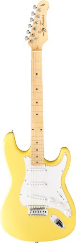 Classic style, double cutaway, solid body, maple neck, maple fingerboard, 3 single coil pickups, 5-position selector switch, 1-v and 2-t, full face white pickguard, standard temolo and die-cast machines, ivory
